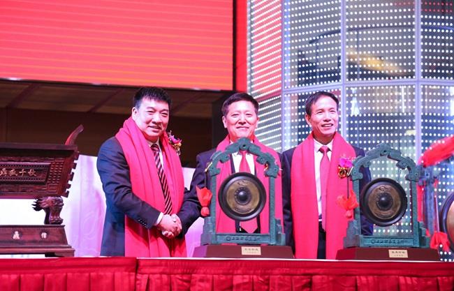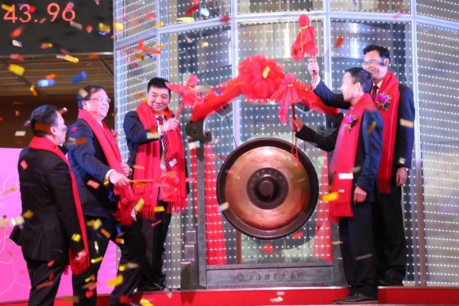 上圖為陳慶堂董事長和福清市人民政府張帆市長、上交所領(lǐng)導(dǎo)共同敲響開市銅鑼