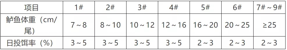 ? 適時轉換合適飼料,并在換料時以兩種規格飼料混合投喂,以減少養殖魚大小差異。