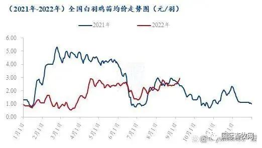 由上圖可見,全國白羽雞苗均價已連續4天呈現上行趨勢,據Mysteel農產品數據統計,截至2022年9月7日全國白羽雞苗均價漲至2.94元/羽,較2021年同期苗價上調0.55元/羽,漲幅23.01%。
