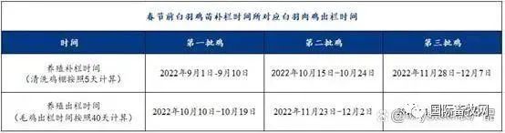 其次,從春節前白羽肉雞出欄批次來看,結合白羽肉雞主產區山東市場的情況,毛雞養殖出欄時間按照40天計算,清洗雞棚時間按照5天計算,那么從9月份至春節前最大極限可出三批雞,第一批雞的補欄時間約從2022年9月1日至9月10日;第二批雞補欄階段約在2022年10月15日至10月24日;第三批雞補欄時間或在2022年11月28日至12月7日。